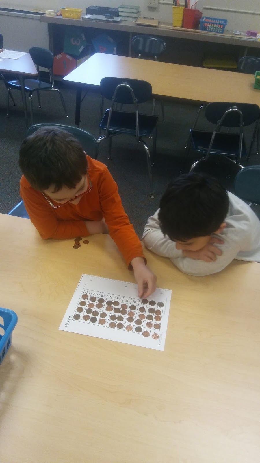 1st Grade: It’s Heavy - A Bag of Pennies: We heard back from our friends Imi and Zani and they have asked for our help again. They have asked us to come up with another measuring task. To add a challenge from our previous task on weight we decided to look at weight in groups of three. This introduced two new terms to the class : heaviest and lightest. The students learned that when we are comparing 2 items we would still use the terms heavier and lighter, but when we look at groups of 3 or more we now can use the new vocabulary of heaviest and lightest. Exploring weight today we looked at groups of 50 and had to decide since they all had the same amount if they would weight the same. There was no tricking this group we made our predictions with our bags and then looked at our results. They were able to explain to me that the pennies are made of metal which weighed more than our cubes of plastic. I challenged them to this thought because our paper clips were made of metal too, but they explained the penny was a solid piece of metal. They had some great thoughts today when comparing weights and materials of items!
